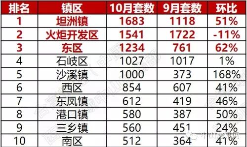 各鎮區成交排名中,火炬開發區2262套,20.88萬方,鎮區排名榜第一;西區1744套,18.46萬方排名第二;坦洲鎮第三,1633套,14.47萬方。